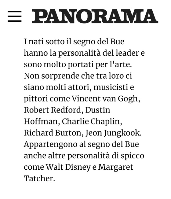 특히 정국은 소띠 출생 네덜란드 화가 빈센트 반 고흐(Vincent Van Gogh)와 할리우드 유명 배우이자 감독인 로버트 레드포드( Robert Redford), 20세기 천재 아티스트이자 영화 역사상 최고의 희극 배우 찰리 채플린(Charlie Chaplin), 골든글로브 상을 6번 수상한 미국 원로 배우 더스틴 호프먼(Dustin Hoffman), 영국 영화계를 대표하는 배우 리차드 버튼(Richard Burton) 등 전설적인 인물들과 함께 리더십, 예술적인 재능을 가지고 있는 공통점을 지닌 아티스트로 꼽혔다.