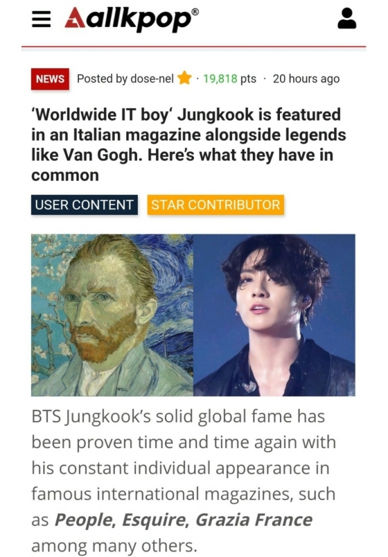 미국 매체 올케이팝은 "'Worldwide IT Boy' 정국이 반 고흐와 같은 전설과 함께 이탈리아 잡지에 실렸다"고 전하며 정국은 국제적 유명 잡지인 피플, 에스콰이어, 그라치아 프랑스 등에서도 그룹이 아닌 개인으로 종종 실려오며 글로벌한 명성을 입증했다고 게재했다.