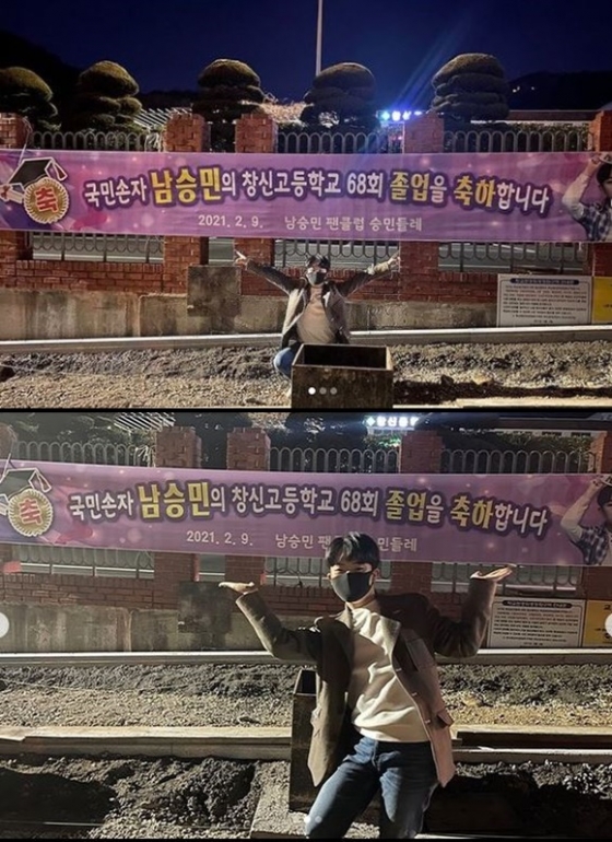 남승민은 9일 자신의 인스타그램에 "3년 간의 고등학교 생활이 오늘 끝났습니다. 비록 스케줄 때문에 (졸업식) 참석은 못했지만 어제 고등학교 앞에서 미리 사진 찍고 인사드리고 왔습니다. 친구들과 좋은 추억 많이 쌓았고 앞으로 있을 20대도 행복한 추억이 가득하도록 파이팅 하겠습니다"라는 글과 함께 세 장의 사진을 게재했다.