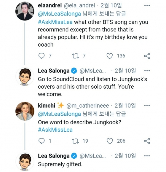 레아 살롱가는 최근 자신의 트위터 공식 계정에 생일에 방탄소년단 노래를 추천해 달라는 팬의 글에 "사운드 클라우드에 가서 정국의 커버곡과 솔로곡을 들어보세요"(Go to SoundCloud and listen to Jungkook’s covers and his other solo stuff. You’re welcome)라고 답했다.