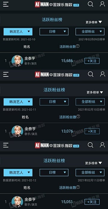 방탄소년단(BTS) 뷔가 중국 빅데이터 분석 전문기관 '아이만'(Aiman)의 '한국 아티스트 팬 활동지수' 3일 연속 1위에 오르며 '아시아 프린스'의 입지를 굳건히 하고 있다.