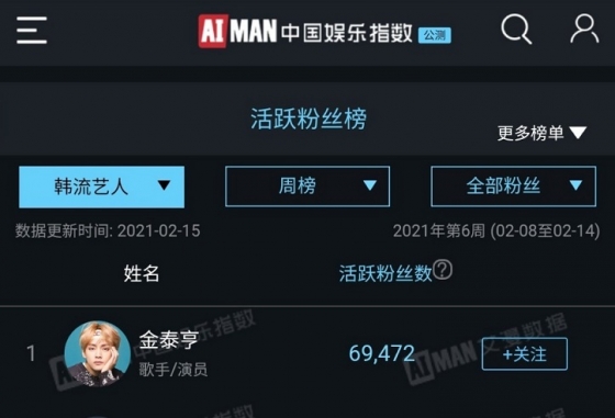 뷔는 중국 빅데이터 전문기관 아이만(Aiman)이 발표한 '한국 아티스트 팬 활동지수' 집계 결과 5일 연속 1위 자리를 차지하며 '위클리 1위' 기록을 달성했다.