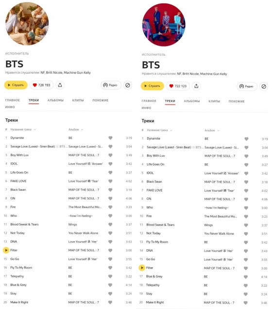 지민의 '필터'는 지난 19일 러시아와 동유럽 지역 최대 음원 사이트이자 러시아 3대 인기 음원 플랫폼 얀데스뮤직(yandexmusic) 'BTS인기곡 톱20'에서 솔로곡으로 유일하게 14위에 올라 솔로 1위를 차지했다.