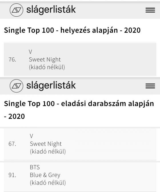 뷔의 자작곡이자 드라마 '이태원 클라쓰' OST 'Sweet Night'은 헝가리 '2020 Single TOP100' 연말 랭킹결산 차트에서 76위를 기록했다.