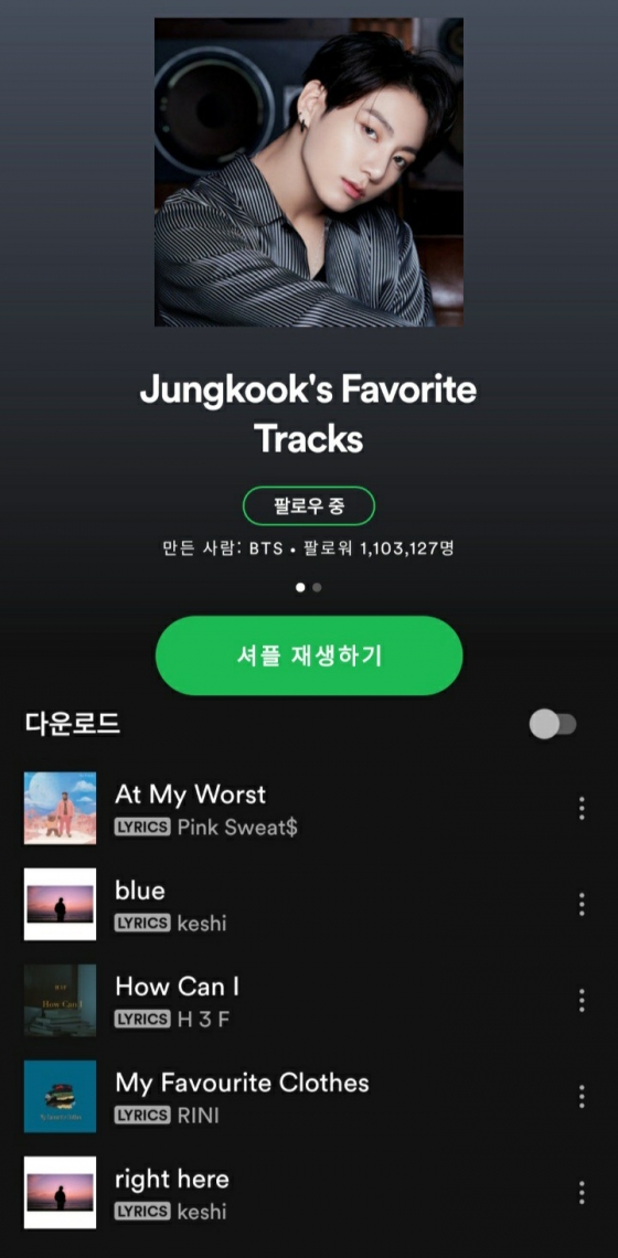 스포티파이에 'Jungkook's Favourite BTS Tracks'으로 등재되어있는 정국의 플레이 리스트는 최근 110만 팔로워를 넘어섰다.