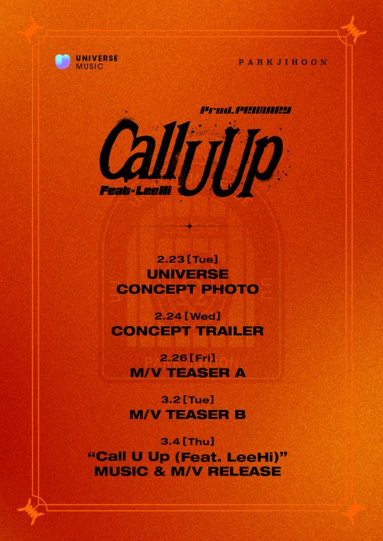 ㈜엔씨소프트, ㈜클렙(Klap)은 23일 "오는 3월 4일 오후 6시 주요 온라인 음원 사이트를 통해 박지훈 'Call U Up'(Feat. 이하이)(Prod. Primary) 음원이 발매된다"라고 밝히고 스케줄러도 공개했다.