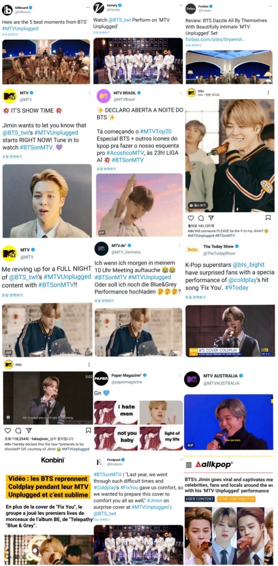 방탄소년단이 한국 가수 최초로 출연한 역사적 무대 'MTV 언플러그드' 방송 후 MTV는 공식 트위터와 인스타그램을 통해 수차례 지민의 단독 이미지를 게시하며 무대를 완전히 장악한 지민의 위력에 대한 즉각적 반응을 보였다.