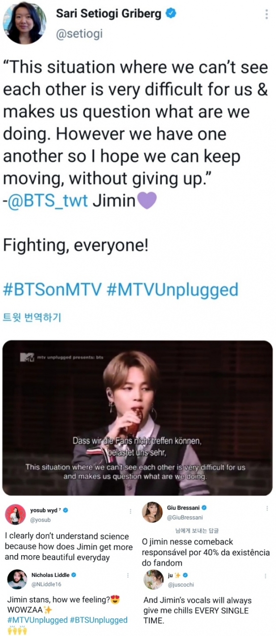 방탄소년단(BTS) 지민이 미국 'MTV Unplugged Presents: BTS' 공연 시작 전부터 현재까지 뜨거운 반응을 얻고 있다.