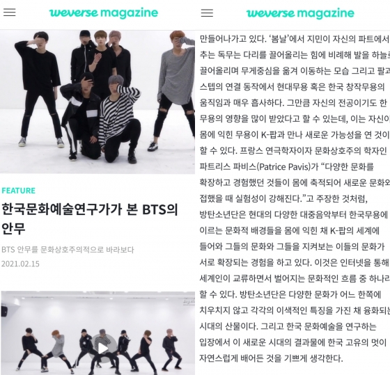 15일 위버스 매거진(Weverse Magazine)은 조용인 한국문화예술연구소 소장이 기고한 '한국문화예술연구가가 본 BTS의 안무'의 제목으로 기획기사를 게재했다.