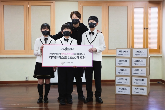 레이든은 지난 2월 27일 서울 중구 파라다이스 복지재단에서 전달식을 갖고 청각장애아동 합창단 아이소리앙상블에 5000만원 상당의 마스크를 기탁했다.
