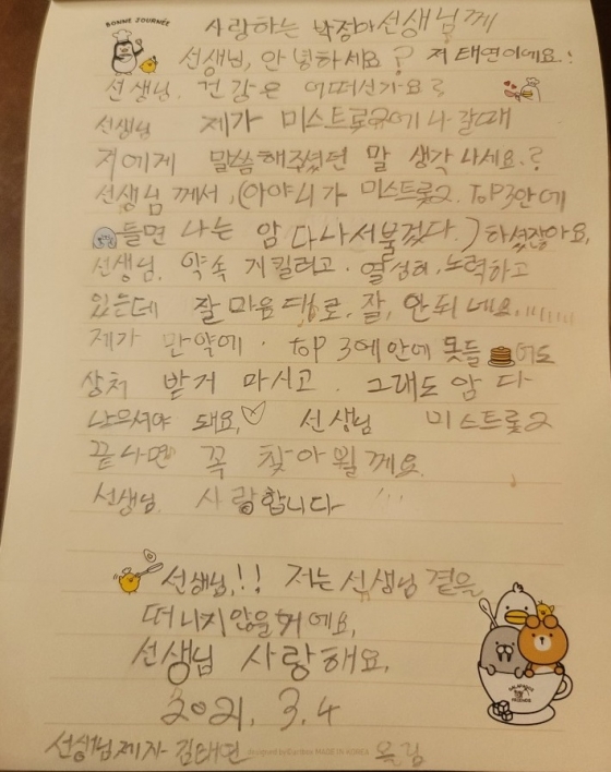끝으로 김태연은 "선생님. 저는 선생님 곁을 떠나지 않을 거예요. 선생님 사랑해요. 선생님 제자 김태연 올림"이라고 덧붙여 보는 이들에게 뭉클한 감동을 선사했다.