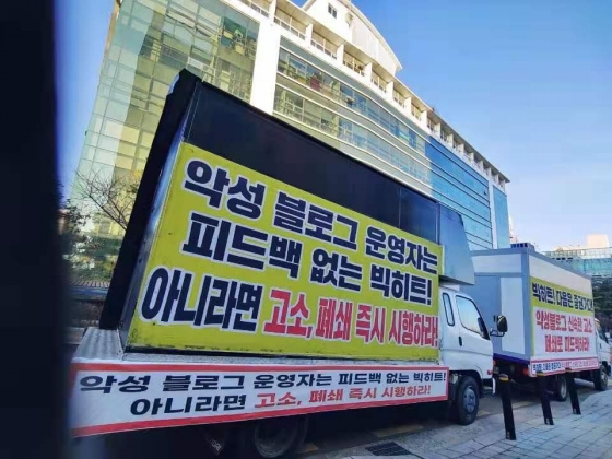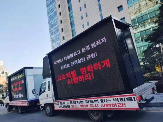 거짓 루머, 합성 사진, 악의적 편집 영상 등 지민과 가족까지 인격을 짓밟는 모독과 비난을 수년째 일삼고 있는 해당 블로그에 대해 팬들은 트럭시위 문구를 통해 '악성 블로그 즉각고소', '신속폐쇄 및 강력 처벌'을 요구했다.
