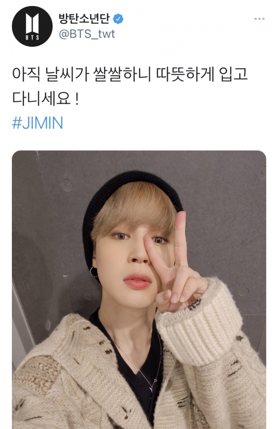 지민은 지난 8일 방탄소년단 공식 트위터에 "아직 날씨가 쌀쌀하니 따뜻하게 입고 다니세요! #JIMIN"이라는 글과 함께 자신의 사진을 게재했다.
