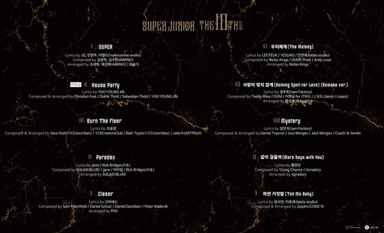 그중 1번 트랙인 'SUPER'는 파워풀한 베이스 사운드와 트렌디한 신스 사운드에 슈퍼주니어만의 에너지가 더해진 곡으로, 강렬한 존재감을 나타낸다. 가사에는 흩어졌던 별들이 다시 모여 또 한 번 마음을 훔쳐내겠다는 당당한 포부를 담았다. 또한 수록곡 'Paradox'는 멀어지려 할수록 가까이 빠져드는 마음을 '역설'에 빗대어 풀어냈고, 강렬한 비트에 속삭이듯 표현된 보컬로 높은 중독성을 자랑한다.