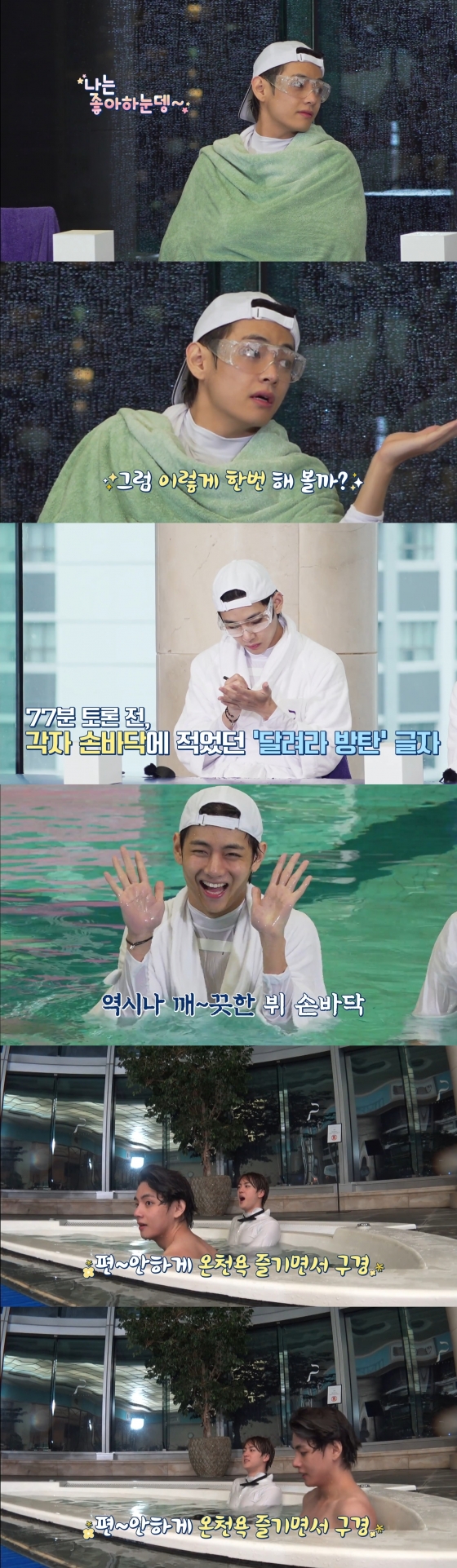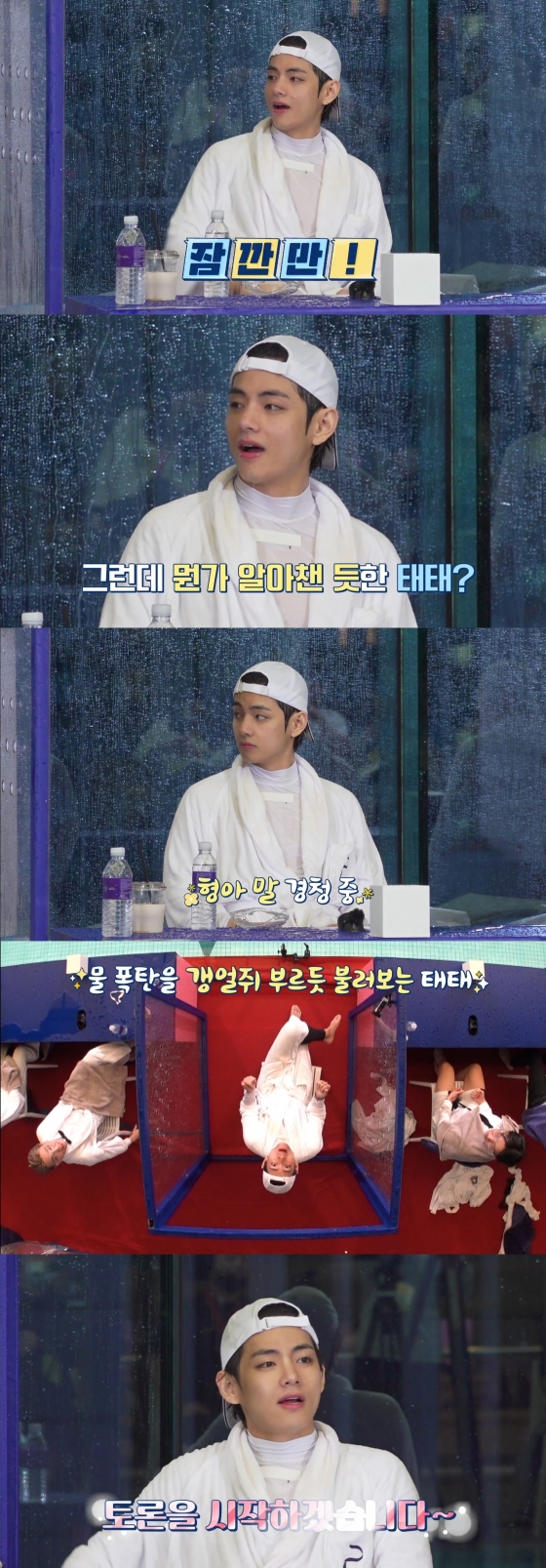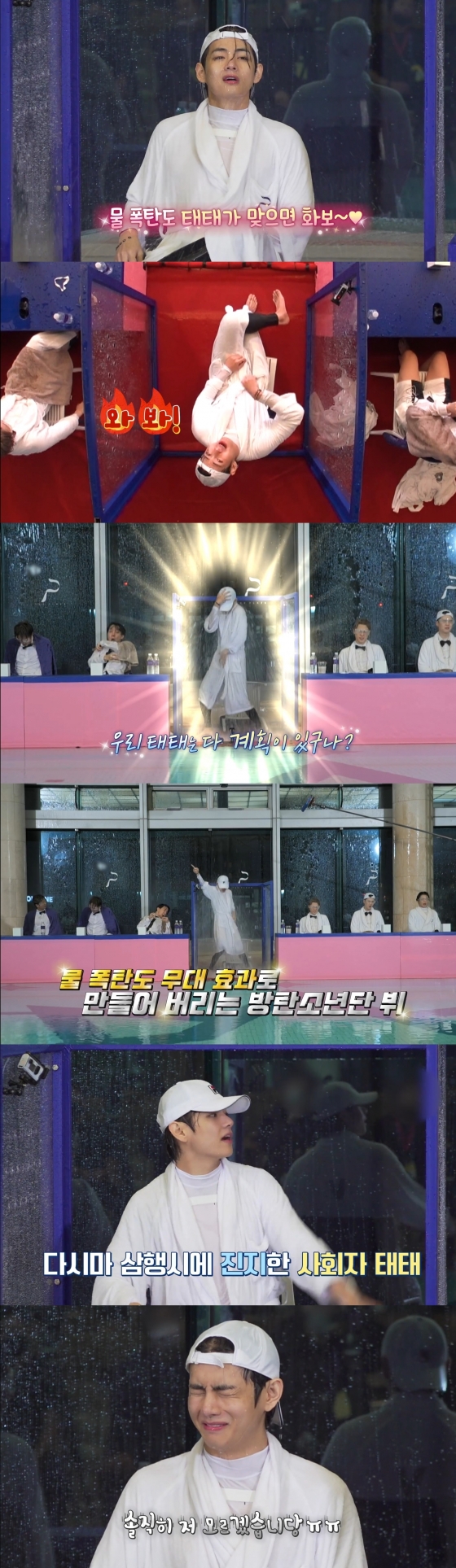 이날 방송에서 뷔는 끝없이 발사되는 물폭탄 속에서 주장을 펼치기 위해 고군분투하며 재치있는 논리를 펼쳐 팬들을 사로잡았다.