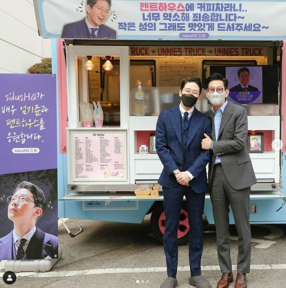 사진 속 두 사람은 커피차 앞에서 환한 미소를 짓고 다정한 포즈를 취하고 있다. 김창열은 "'펜트하우스'에 커피차라니 너무 약소해 죄송합니다~ 작은 성의 그래도 맛있게 드셔주세요~"라는 문구로 응원을 전했다.