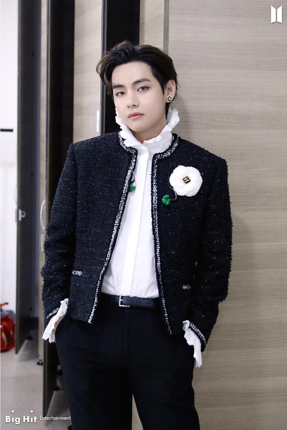 대기실에서 촬영된 사진에서는 반짝이는 무대 의상이 더해져 만화를 찢고 나온 왕자님의 매력을 선보였다. 이마를 드러낸 헤어 스타일에 반짝이는 자켓, 프릴이 목까지 올라오는 셔츠, 우아한 꽃 브로치까지 화려한 스타일링도 기품있게 소화한 뷔는 그 자체로 만찢남의 정석을 선보였다.