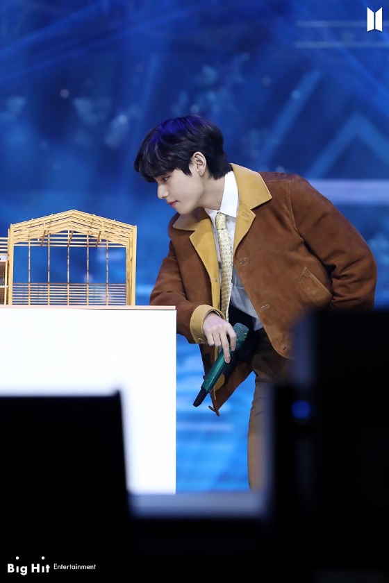 뷔는 무대 위 계단에서 카메라를 응시하며 눈빛 하나로 보는 이들을 매료시키기도 했다. 라운지웨어 스타일의 의상에 자신의 마이크 색과 같은 초록색 가운을 매치한 뷔는 귀여운 컬이 돋보이는 헤어스타일을 연출해 사랑스러운 매력을 어필했다. 여기에 카메라 너머 팬들을 바라보는 듯한 뷔의 깊은 눈빛이 더해져 눈을 뗄 수 없는 한 컷을 완성했다.