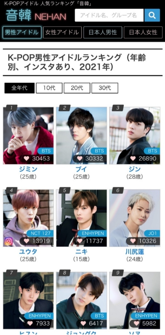 방탄소년단(BTS) 지민이 일본의 K팝 아이돌 순위 사이트 '네한’(NEHAN, 音韓)에서 인기 순위 1위를 차지하며 일본 내 인기를 재확인했다.