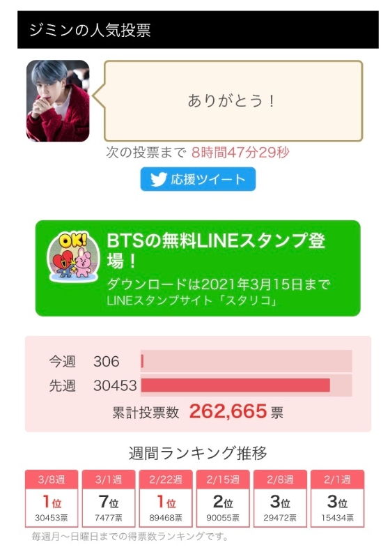 화이트데이에 마감된 투표에서 가장 많은 지지를 받은 지민의 일본 인기는 음원 순위에서도 확인 할 수 있다.