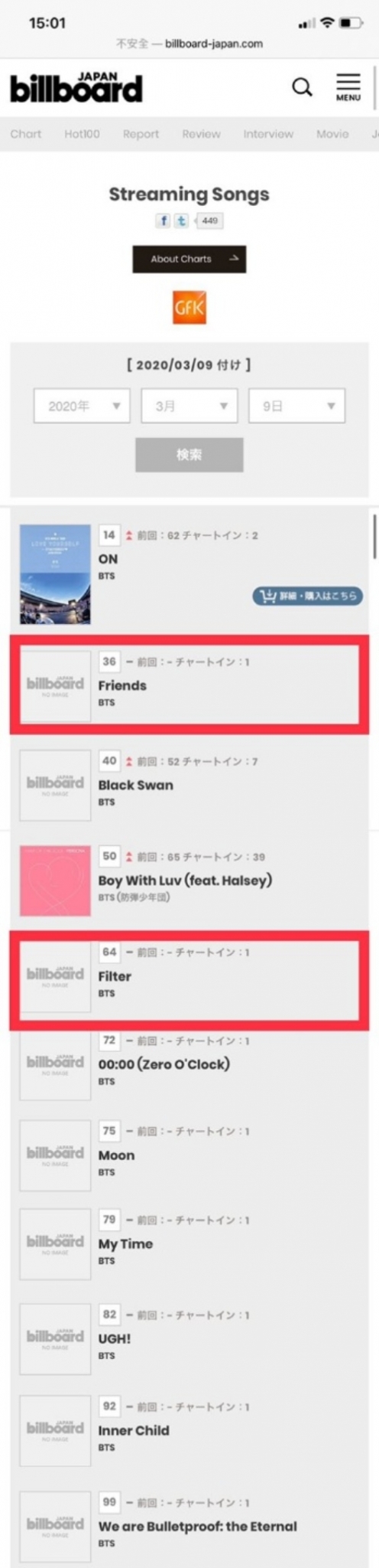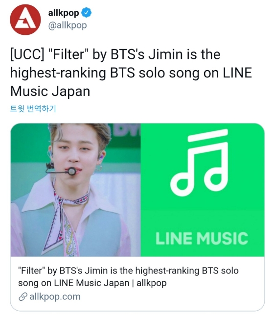 일본 최대 음원 사이트 가운데 하나인 라인 뮤직에서 지민의 솔로곡 '필터'는 '라인 뮤직 2020년 연간 K팝 톱100'에서 59위에 올라 방탄소년단 모든 솔로곡 중 최고 순위를 기록했다.