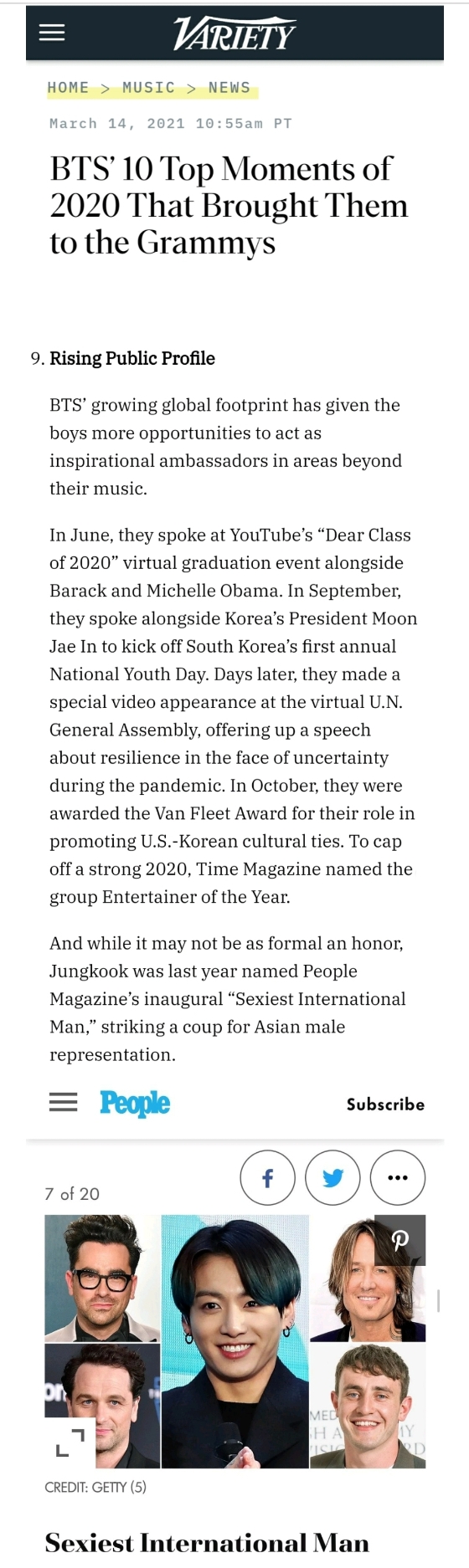 버라이어티는 공식적인 영예는 아닐지라도 정국은 지난해 피플 매거진의 '가장 섹시한 인터내셔널 맨'으로 선정되어 아시아 남성을 대표해 엄청난 주목을 받았다며 인상 깊게 다뤘다.