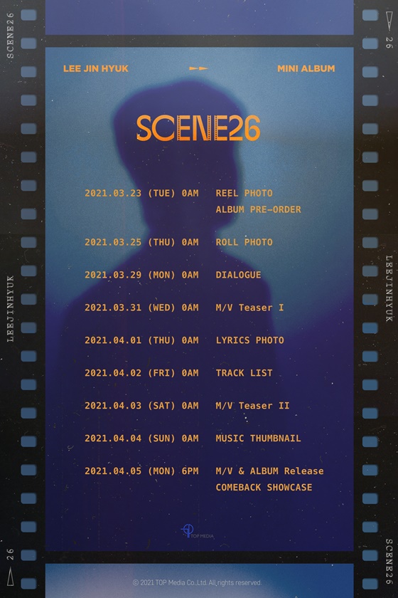 컴백 스케줄러에 따르면 이진혁은 오는 4월 5일 미니앨범 'SCENE26'을 발표한다. 이에 앞서 오는 23일 REEL PHOTO를 시작으로 ROLL PHOTO, 뮤직비디오 티저, 트랙 리스트, 뮤직 썸네일 등 다채로운 티징 콘텐츠를 오픈한다.
