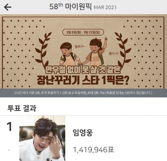 임영웅은 마이원픽(MY1PICK)이 지난 8일부터 21일까지 진행한 '만우절 없이 못 살 것 같은 장난꾸러기 스타 1픽은?' 투표에서 141만 9946표를 얻어 1위를 차지했다.