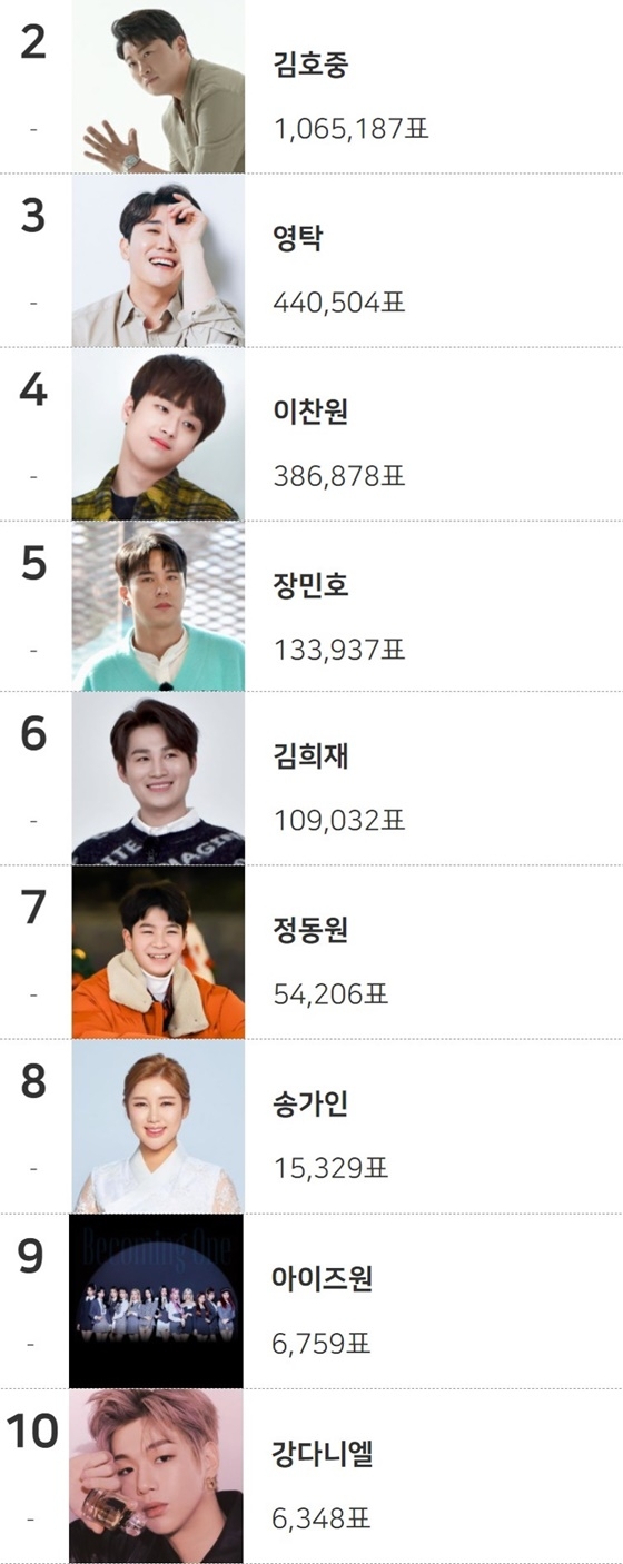 임영웅에 이어 2위 김호중(106만 5187표), 3위 영탁(44만 504표), 4위 이찬원(38만 6878표), 5위 장민호(13만 3937표), 6위 김희재(10만 9032표), 7위 정동원(5만 4206표), 8위 송가인(1만 5329표), 9위 아이즈원(6759표), 10위 강다니엘(6348표) 순이었다.