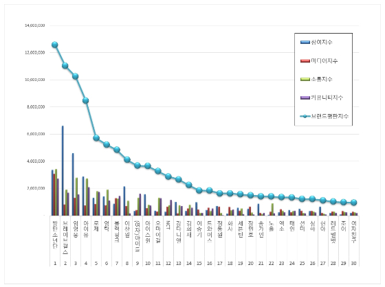 1위 방탄소년단( RM, 슈가, 진, 제이홉, 지민, 뷔, 정국 ) 브랜드는 참여지수 337만 1295 미디어지수 307만 1263 소통지수 340만 9162 커뮤니티지수 272만 8685가 되면서 브랜드평판지수 1258만 406으로 분석됐다. 지난 2월 브랜드평판지수 1321만 5433과 비교하면 4.81% 하락했다.
