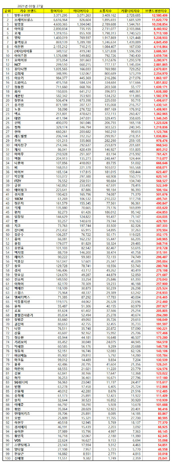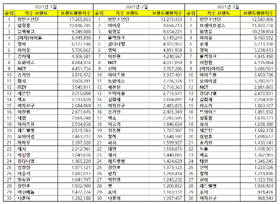 2021년 3월 가수 브랜드평판 30위 순위는 방탄소년단, 브레이브걸스, 임영웅, 아이유, 로제, 영탁, 블랙핑크, 이찬원, (여자)아이들, 아이즈원, 오마이걸, NCT, 강다니엘, 김희재, 이승기, 트와이스, 정동원, 화사, 세븐틴, 장민호, 송가인, 노을, 엑소, 태연, 선미, 청하, 현아, 레드벨벳, 조이, 여자친구 순으로 분석됐다.