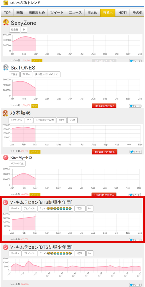 1월에서 3월까지 '유명인 랭킹'에 뷔가 언급된 트위터 수는 약 438000개로 그룹으로 이름을 올린 3, 4위권 스타들과 크게 차이나지 않는다.