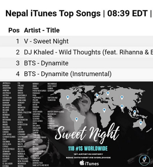 지난해 3월 발매한 인기드라마 '이태원클라쓰'OST인 뷔의 자작곡 'Sweet Night'은 네팔에서 아이튠즈 1위를 기록, 총 118개국가 아이튠즈 1위를 기록했다.