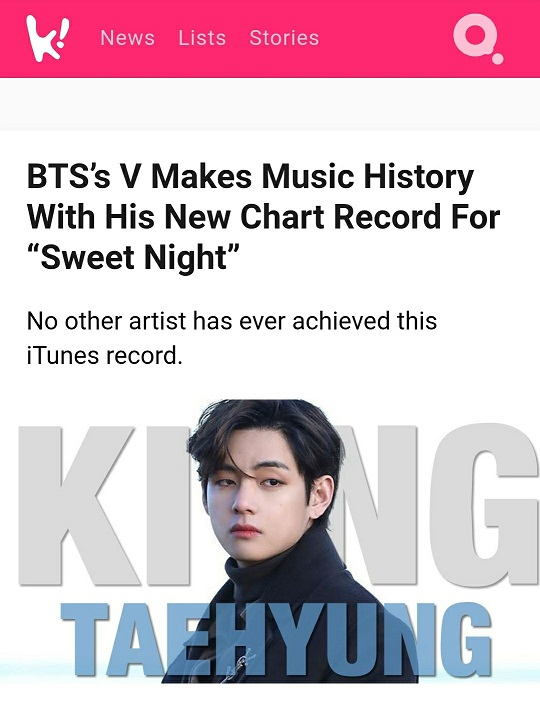 방탄소년단(BTS) 뷔가 'Sweet Night'으로 118개국 아이튠즈 톱 송 차트 1위 대기록을 세웠다.