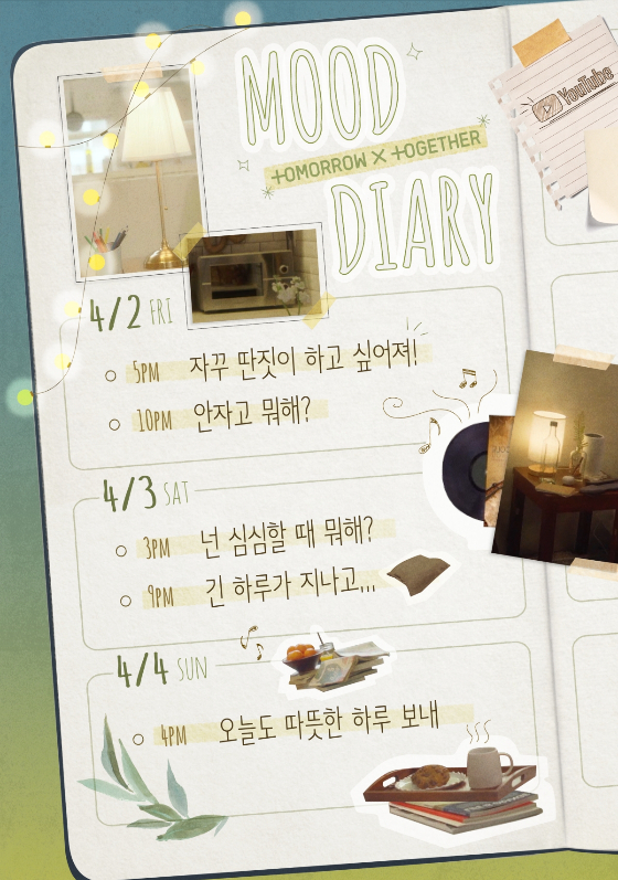 투모로우바이투게더의 ‘Mood Diary’는 멤버들의 5인 5색 음악 취향을 엿볼 수 있는 특별한 콘텐츠다. 다섯 멤버가 직접 고른 플레이리스트가 담겨 전 세계 팬들의 뜨거운 반응을 불러일으킬 것으로 보인다.