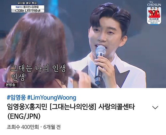 지난해 9월 11일 임영웅 공식 유튜브 채널에 공개된 '임영웅X홍지민 [그대는나의인생] 사랑의콜센타 (ENG/JPN)' 영상은 2일 400만 뷰를 돌파했다.