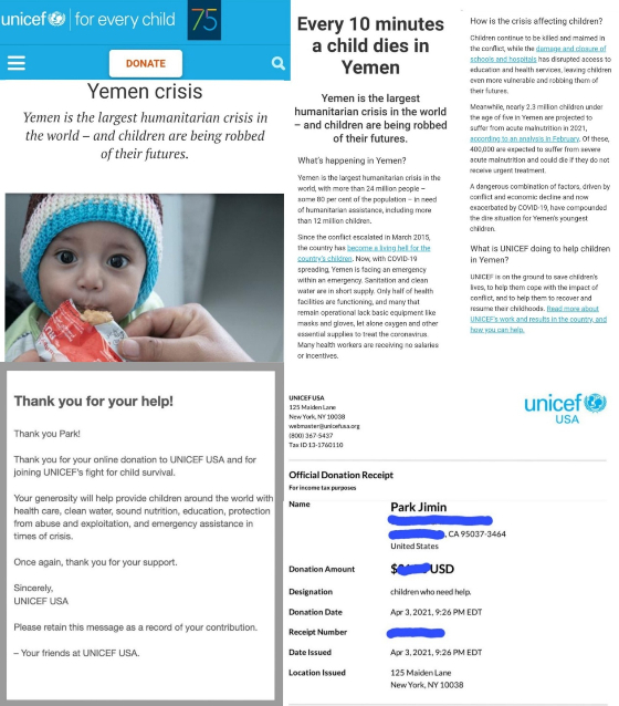 4일에도 '부활절 축하 행사는 이제 지구 반대편에서 시작되며, 우리는 예멘의 어린이들을 구하고 그들의 유년시절을 다시 시작하도록 돕기 위해 미국 '유니세프'(UNICEF)에 '박지민' 이름으로 또 다른 의미 있는 기부를 하기로 했다'며 뜻깊은 두번째 선행으로 지민을 향한 응원과 사랑을 전했다.