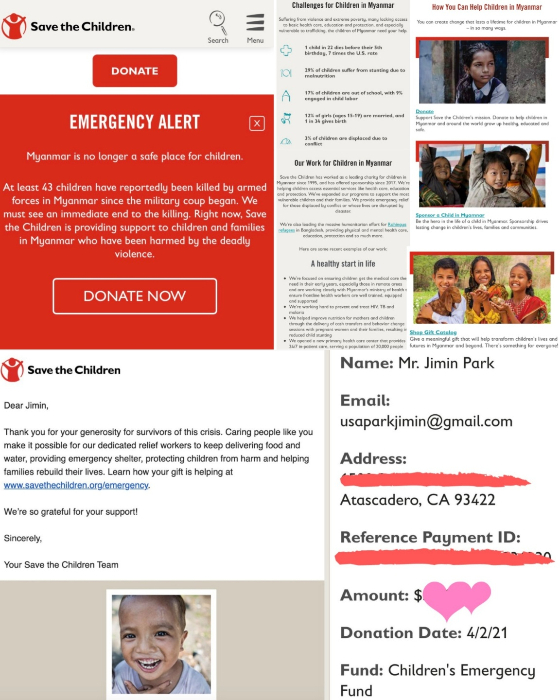 'Park Jimin USA'는 3일 트위터 계정을 통해 '부활절의 핵심은 다른 사람에게 주는 것이다. 우리는 치명적인 폭력으로 피해를 입은 미얀마의 어린이들과 가족들을 돕기 위해 '박지민'으로 세이브 더 칠드런 인터내셔널(Save the Children International)에 기부했다'고 밝혔다.