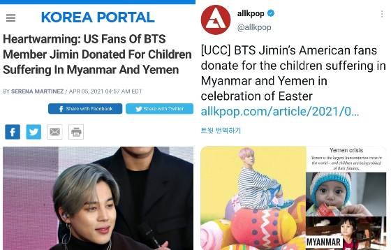 지민의 미국 팬 베이스 'Park Jimin USA'는 부활절을 맞아 지난 3일과 4일 이틀에 걸쳐 미얀마와 예멘에서 고통받는 어린이들을 위한 기부 선행을 펼쳤다.