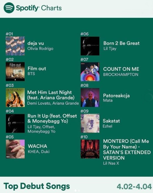 스포티파이는 7일 오전 (KST 기준) 지난 2일부터 4일까지 글로벌 '톱 데뷔 송즈 10'(Top Debut Songs) 차트를 공개했다.
