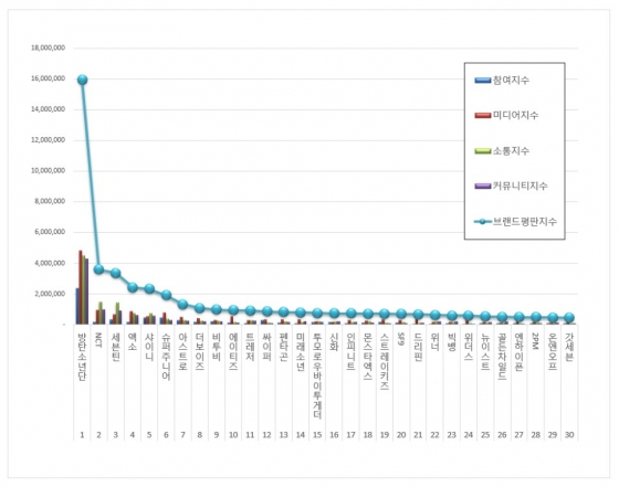 1위, 방탄소년단(RM, 슈가, 진, 제이홉, 지민, 뷔, 정국 ) 브랜드는 참여지수 236만 9488 미디어지수 480만 1102 소통지수 447만 1391 커뮤니티지수 429만 6222가 되면서 브랜드평판지수 1593만 8202로 분석됐다. 지난 3월 브랜드평판지수 1092만 2131과 비교하면 45.93% 상승했다.
