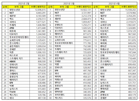2021년 4월 보이그룹 브랜드평판 30위 순위는 방탄소년단, NCT, 세븐틴, 엑소, 샤이니, 슈퍼주니어(SUPER JUNIOR), 아스트로(ASTRO), 더보이즈(THE BOYZ), 비투비(BTOB), 에이티즈(ATEEZ), 트레저(TREASURE), 싸이퍼(CIIPHER), 펜타곤(PENTAGON), 미래소년(MIRAE), 투모로우바이투게더(TOMORROW X TOGETHER), 신화(SHINHWA), 인피니트(INFINITE), 몬스타엑스(MONSTA X), 스트레이키즈(STRAY KIDS), SF9, 드리핀(DRIPPIN), 위너(WINNER), 빅뱅(BIGBANG), 위더스(WITHUS), 뉴이스트(NU'EST), 골든차일드(GOLDEN CHILD), 엔하이픈(ENHYPHEN), 2PM, 온앤오프(ONF), 갓세븐(GOT7) 순으로 분석됐다.