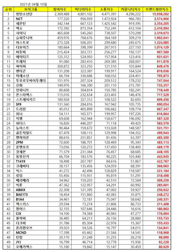 한국기업평판연구소는 2021년 3월 10일부터 2021년 4월 10일까지 측정한 보이그룹 브랜드 빅데이터 5147만 4174개를 소비자 행동분석을 통해 보이그룹 브랜드에 대한 참여지수, 미디어지수, 소통지수, 커뮤니티지수를 측정하였다. 지난 3월 브랜드 빅데이터 4227만 5234개와 비교해보면 21.76% 증가했다.