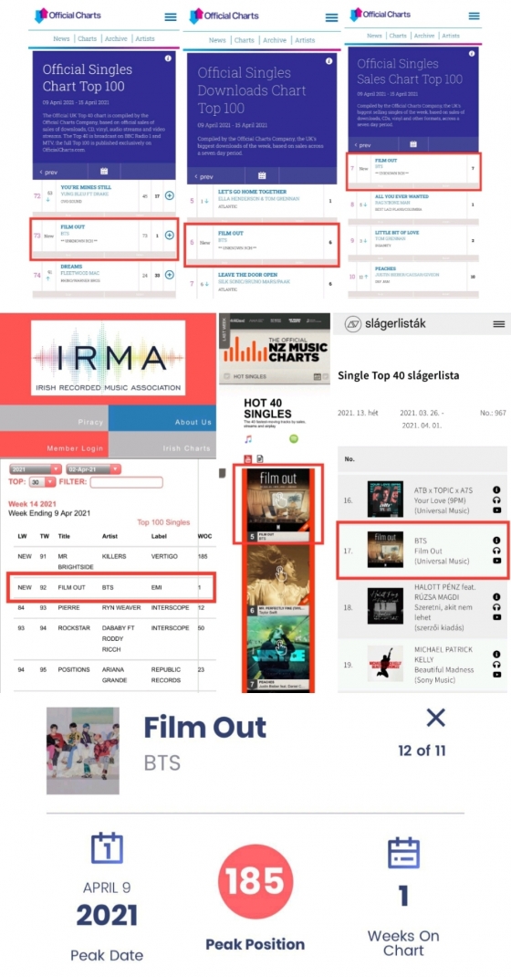 또 빌보드가 발표한 최신 차트(4월 10일자)에 따르면 글로벌 익스클릭스 차트에 'Film out'은 185위로 데뷔, 음원 공개 13시간 만에 글로벌 익스클릭스 차트에 진입하는 기록을 세웠다.