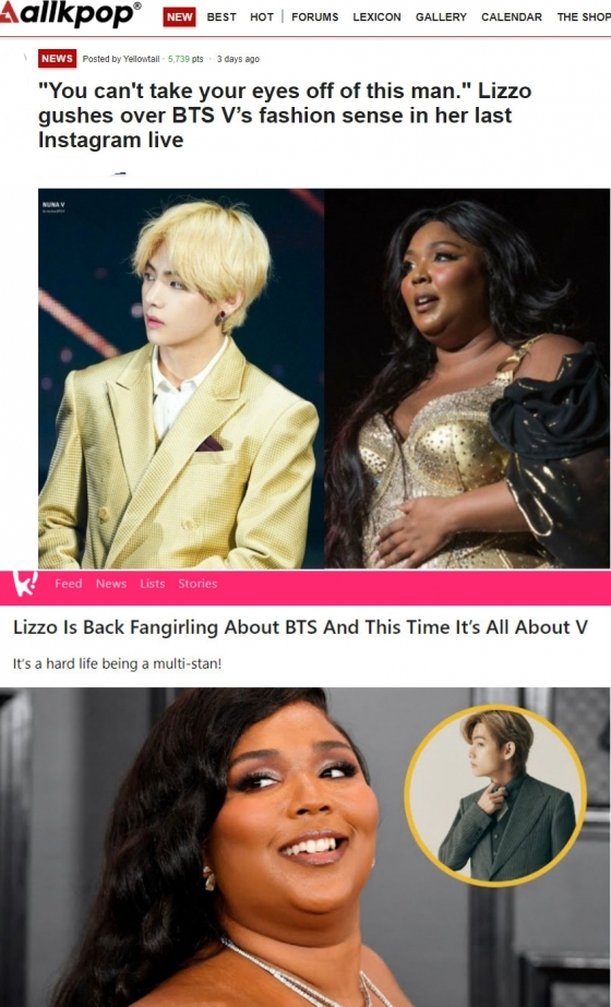 북미매체 코리아부에 따르면 리조는 최근 인스타그램 라이브 도중 '패션센스가 가장 마음에 드는 스타가 누구냐'라는 질문에 주저 없이 뷔를 꼽았다.