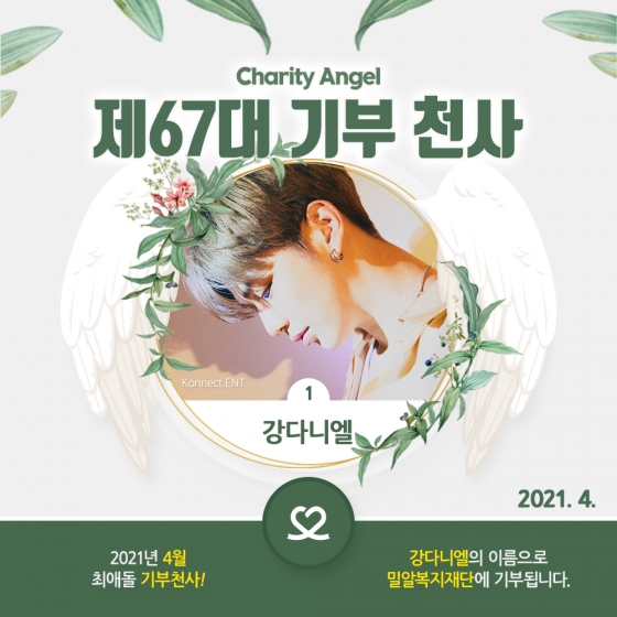 무려 20개월 연속 기부천사를 놓치지 않고 있는 강다니엘은 지금까지 기부천사 37회, 기부요정 31회로 총 68회 기부했다. 누적 기부금액은 3400만 원이다.