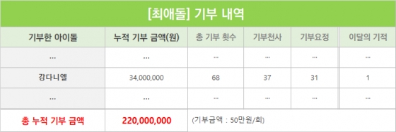 ‘최애돌’은 종합 누적 순위 1위를 달성하면 기부천사, 기념일에 5555만 5555표 이상을 달성하면 기부요정으로 선정해 기부하고 있다. 기부천사가 된 강다니엘이름으로 50만 원이 밀알복지재단에 기부된다. 지금까지 총 누적 기부금액은 2억 2,000만 원이다.