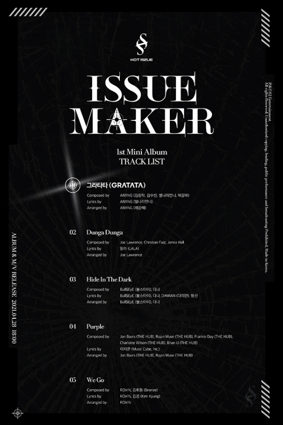 12일 0시 공식 SNS 채널을 통해 공개된 핫이슈의 데뷔 앨범 'ISSUE MAKER' 트랙리스트에 따르면 이번 앨범에는 타이틀곡 '그라타타(GRATATA)'를 포함해 'Dunga Dunga', 'Hide In The Dark', 'Purple', 'We go' 총 5개 곡이 수록된다.