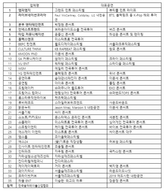 국내 대중음악공연을 주최, 주관, 제작하고 있는 대표적인 35개사가 모여 한국대중음악공연산업협회(이하 음공협)을 발족했다.
