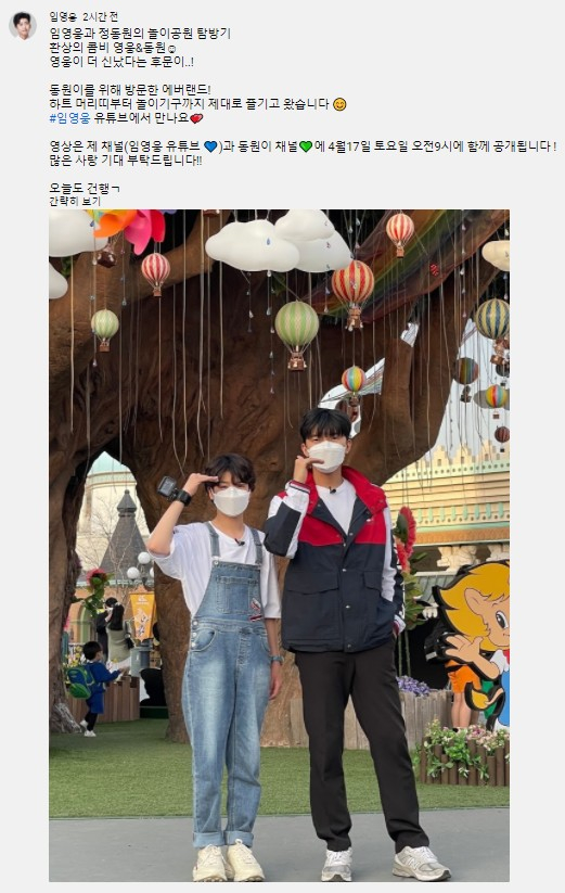 임영웅 공식 유튜브 채널은 지난 15일 커뮤니티 페이지를 통해 오는 17일 오전 9시 임영웅과 정동원의 에버랜드 탐방기를 공개한다고 밝혔다.